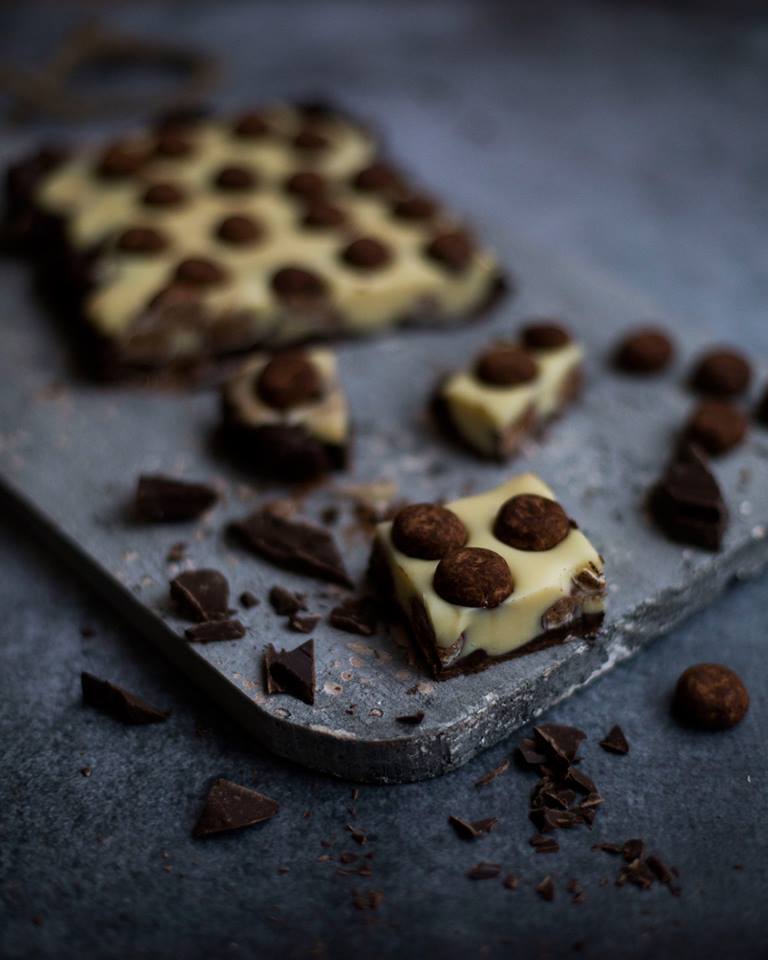 - Bekleed een bakvorm (20 x 30 cm) met bakpapier. Giet de gesmolten chocolade op de bodem.